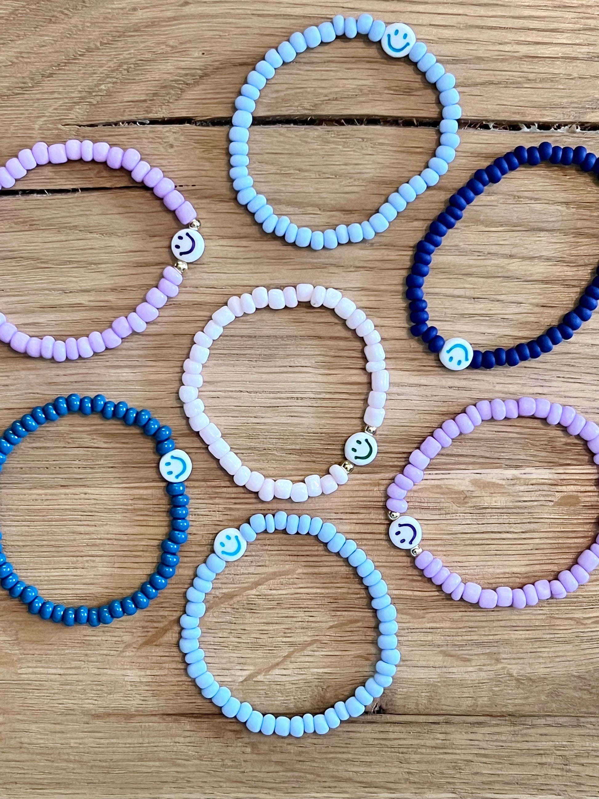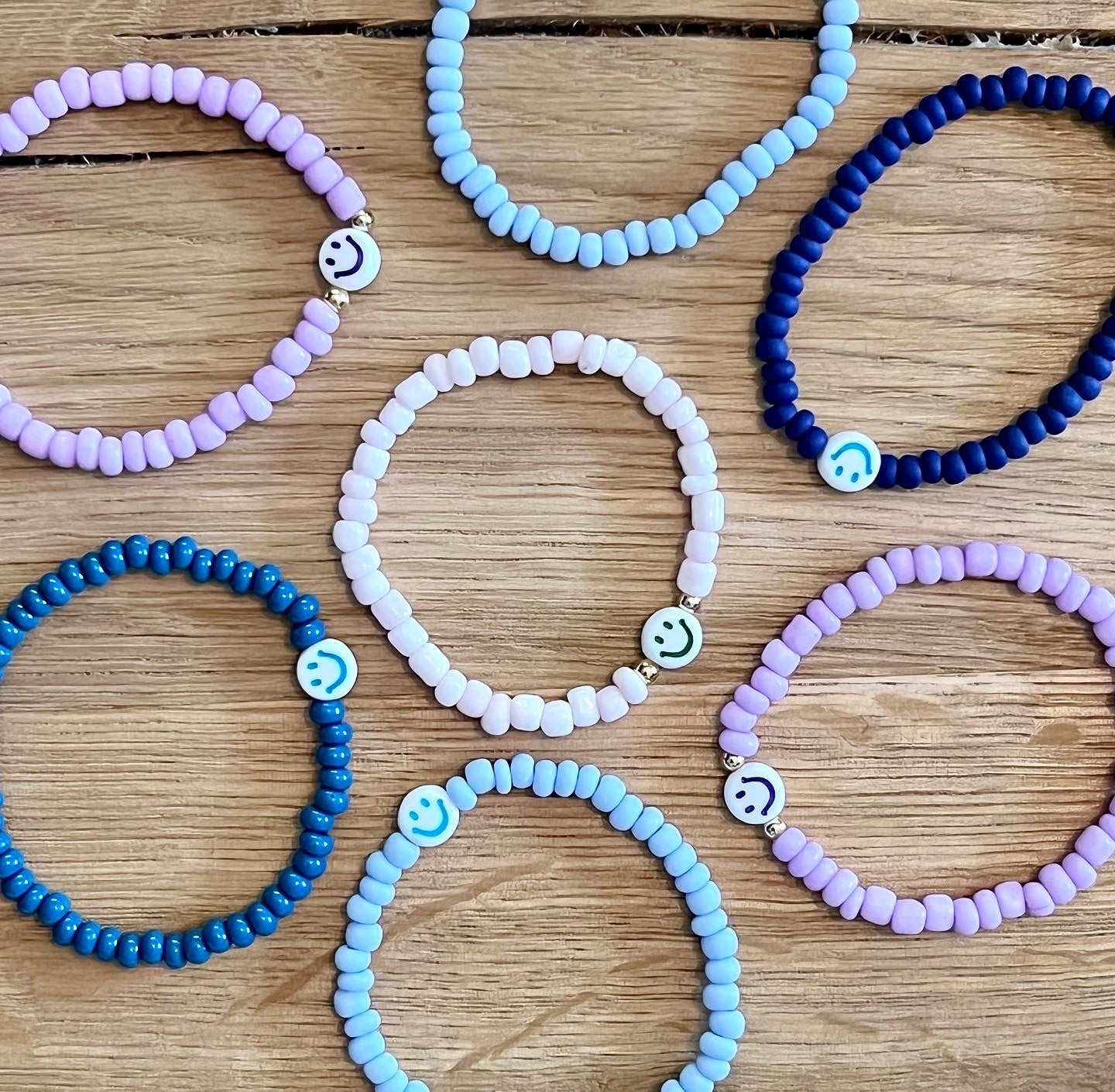 Our original Happy Face mini bracelet now in a 2 piece set. Give one to your BFF, sibling, or gift as a pair. Happy Face mini bracelets are the perfect accessory for kids. Simple seed beads are paired with a colorful acrylic happy face bead.