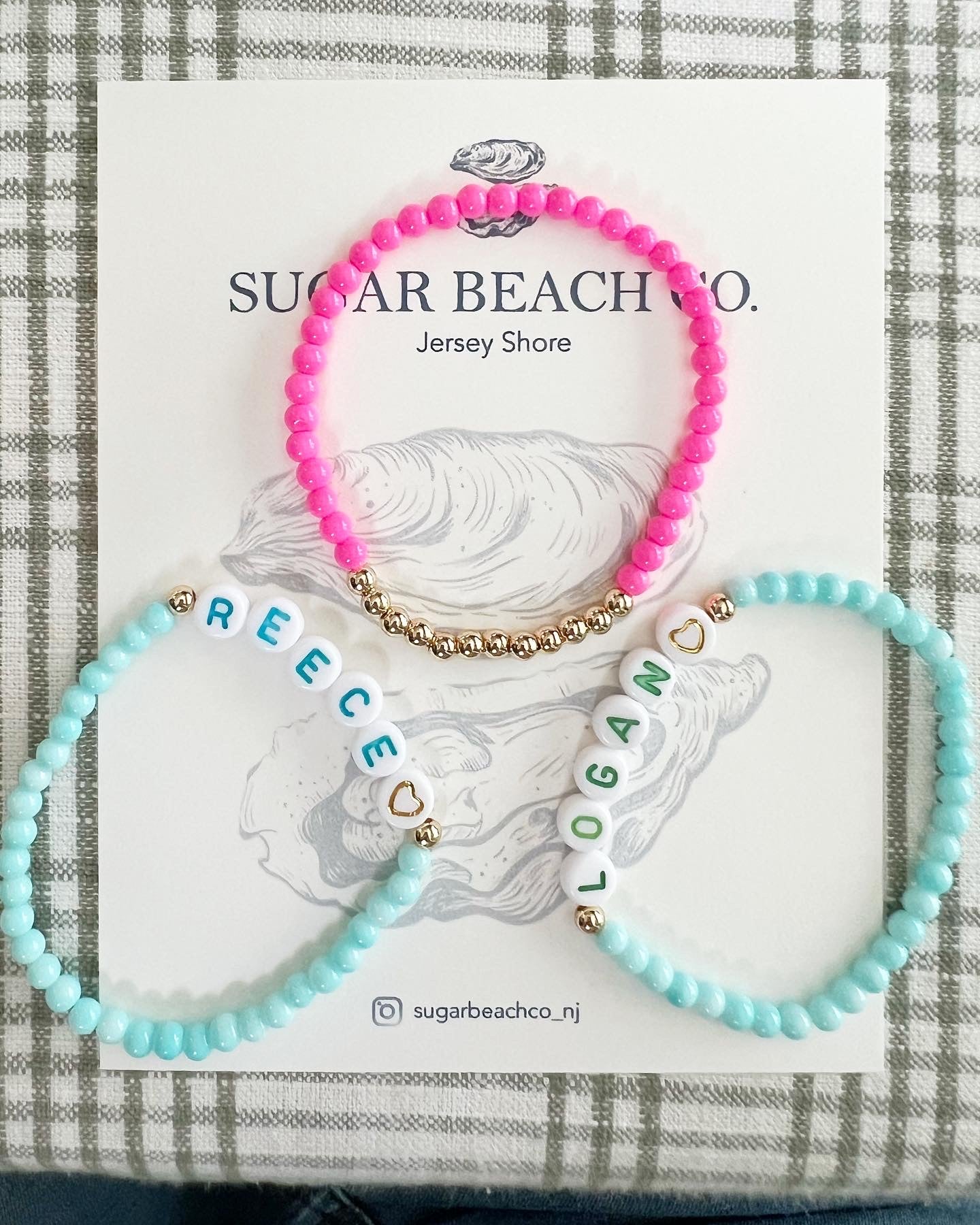 - By default, gold beads will flank the letters. Note at checkout to have them removed