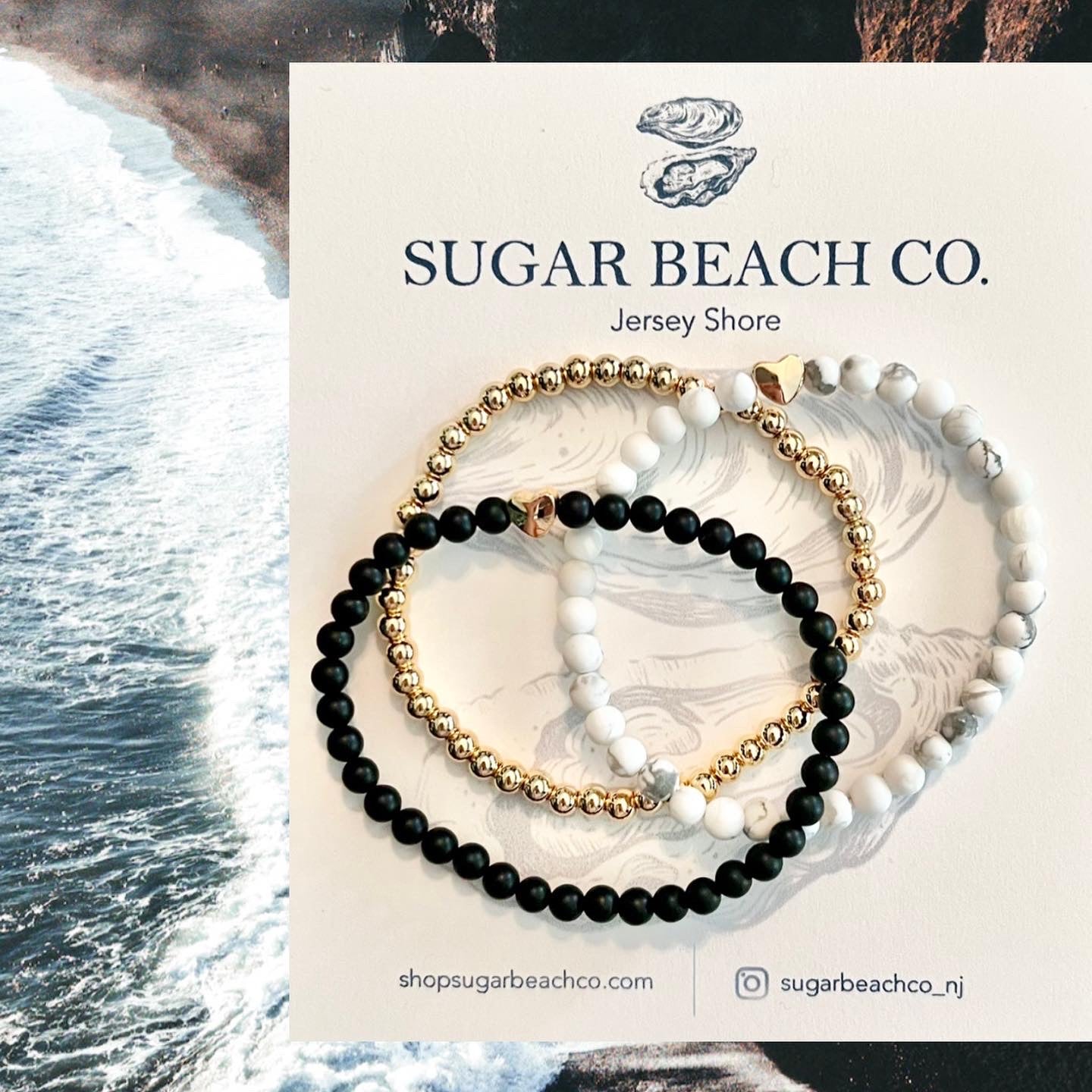 Black, marble and gold, the perfect set for colder months. Part of the Gemstone Collection, this stack includes matte white howlite and matte black onyx with the classic Sugar Beach Co. gold heart, and a 3mm 14k gold-filled beaded bracelet (daintier than our 4mm size).