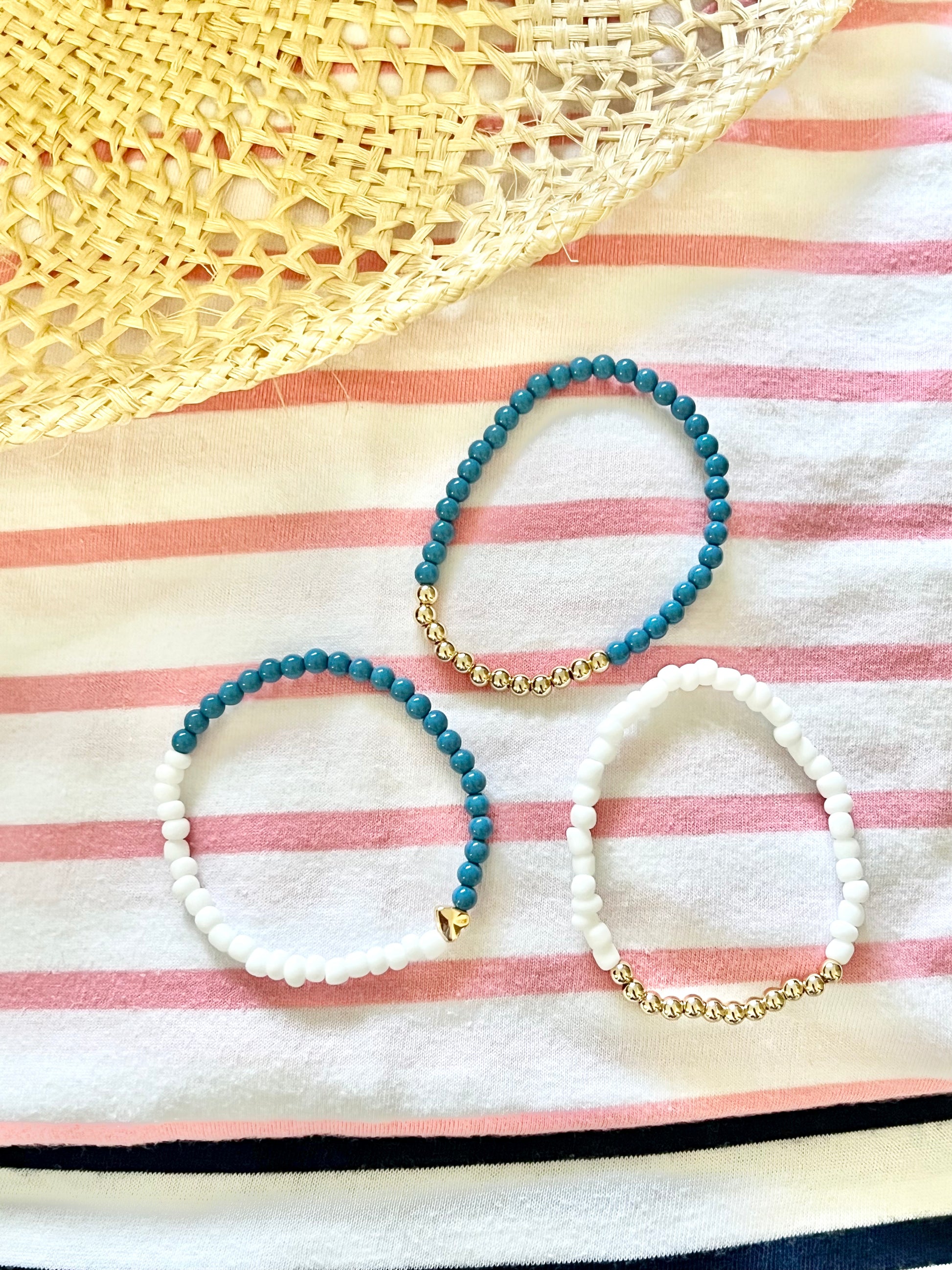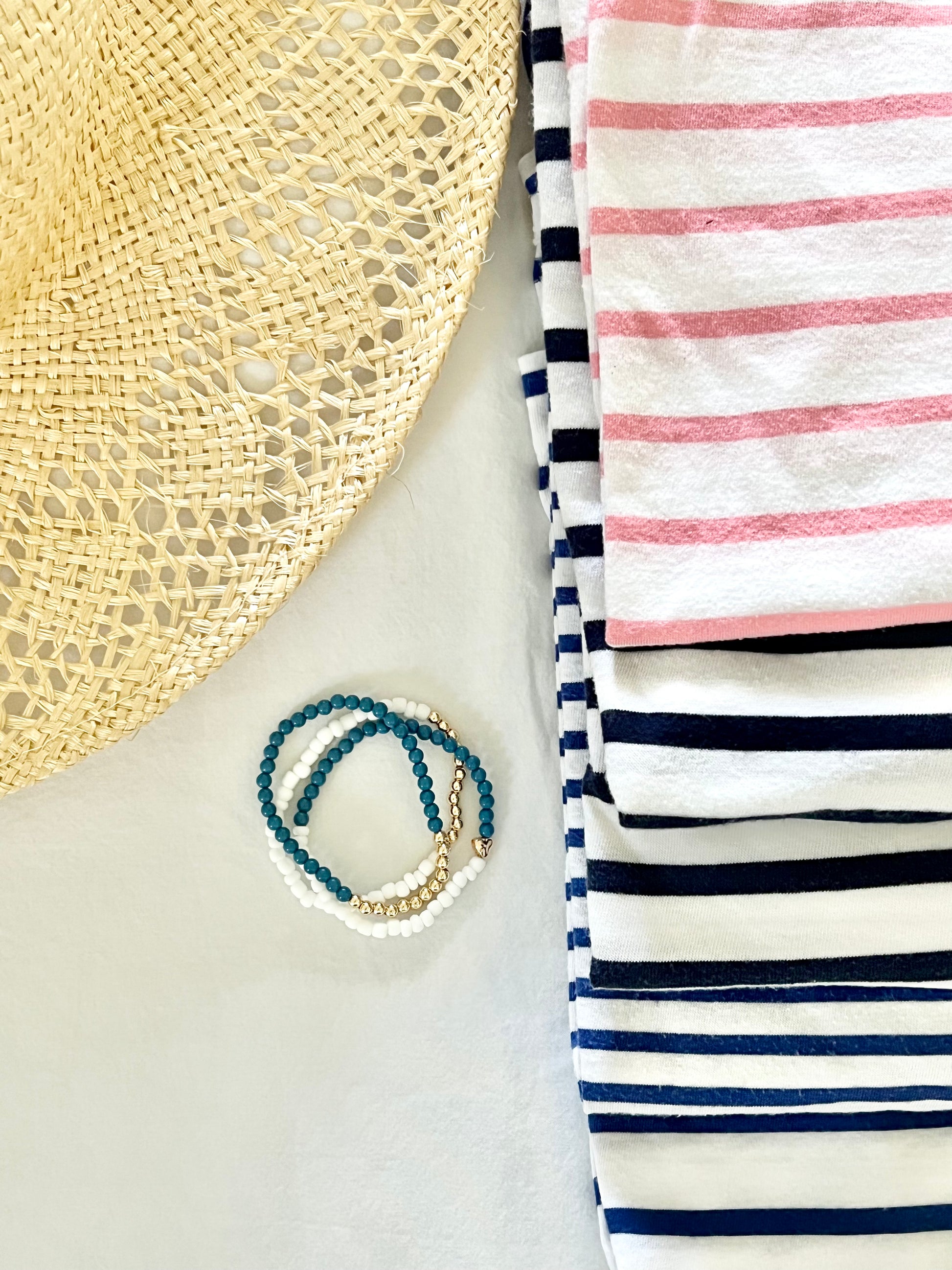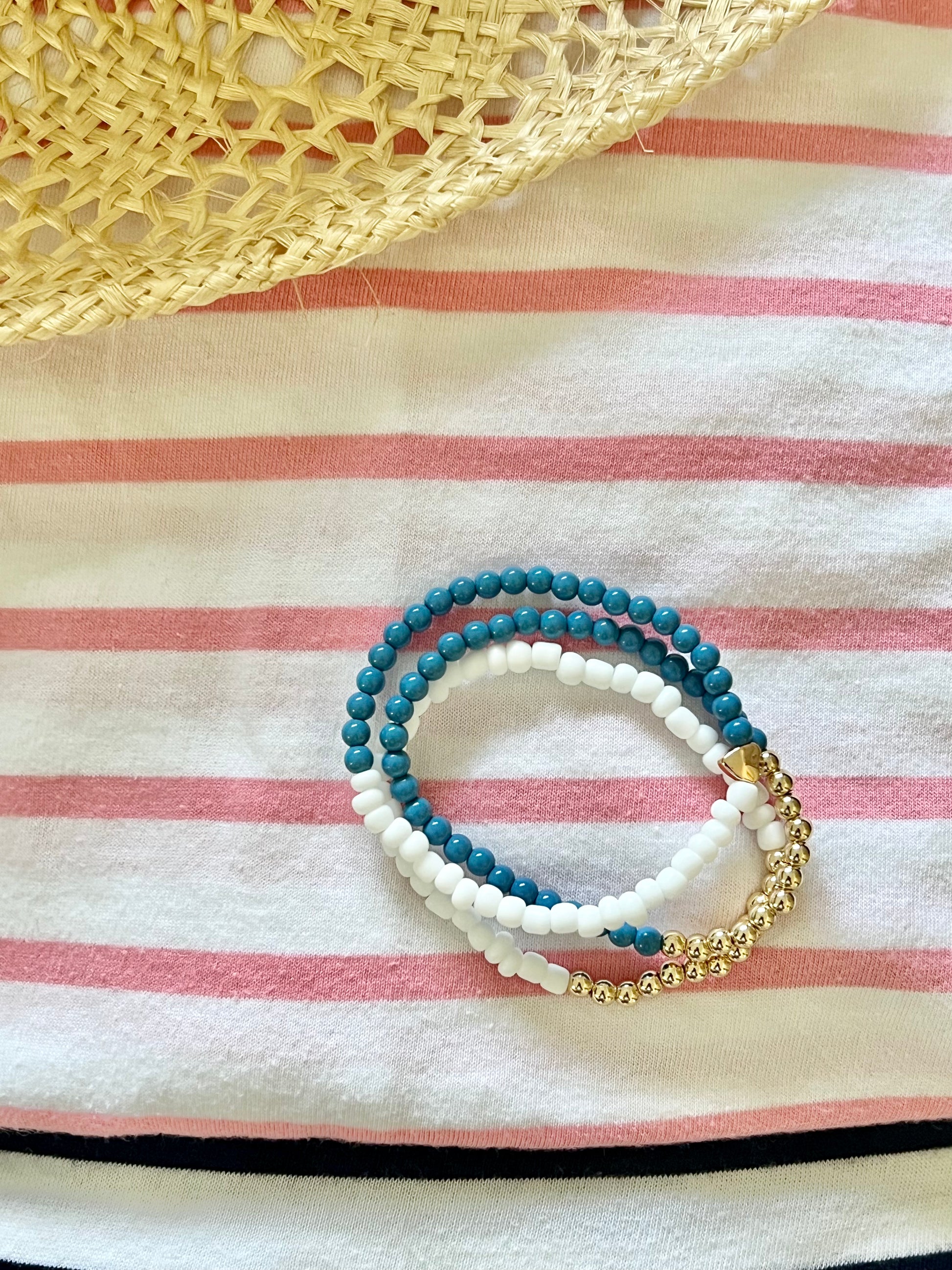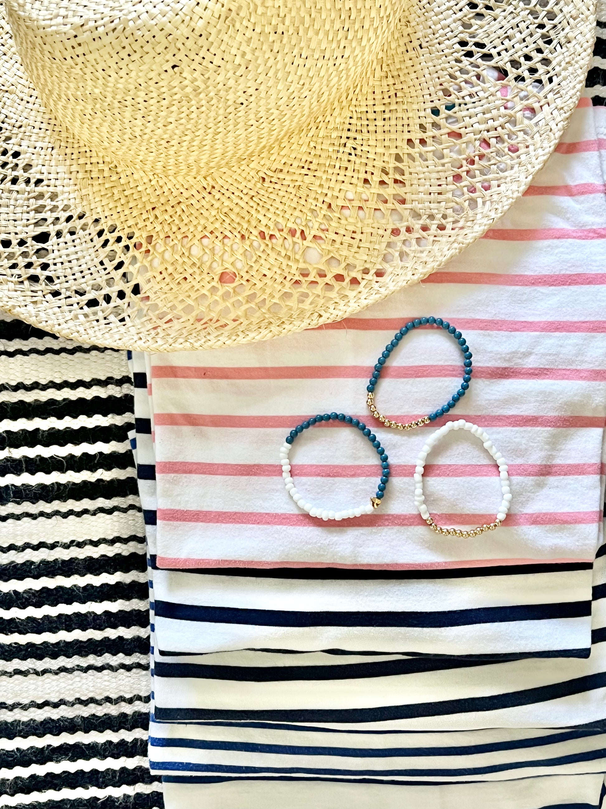 Reminiscent of the classic French striped mariner shirts, this three piece set will make your striped dreams come true. Includes stack of 3 bracelets: Mariner color Half & Half, White with Gold Bar, and Mariner color with Gold Bar.