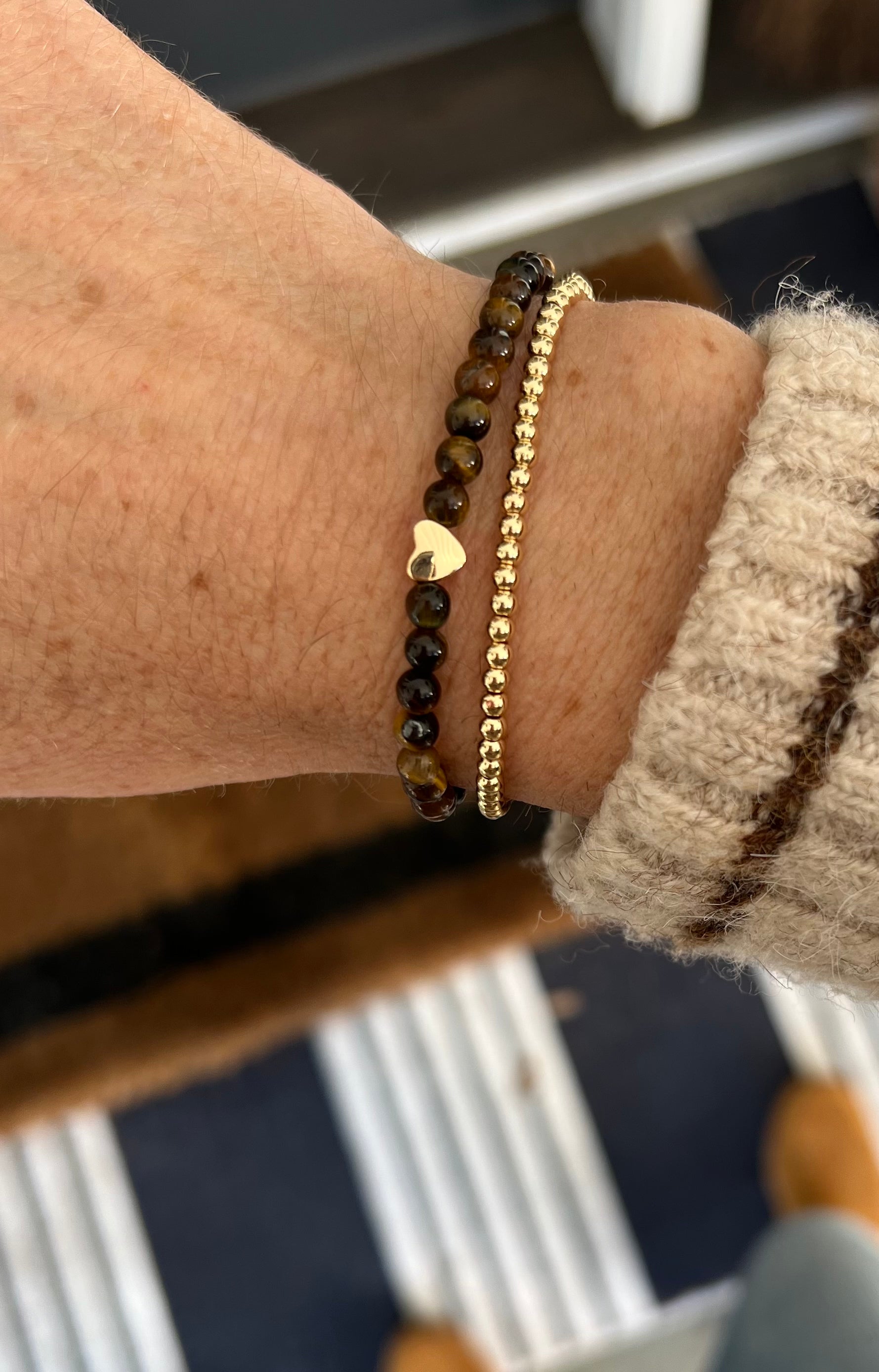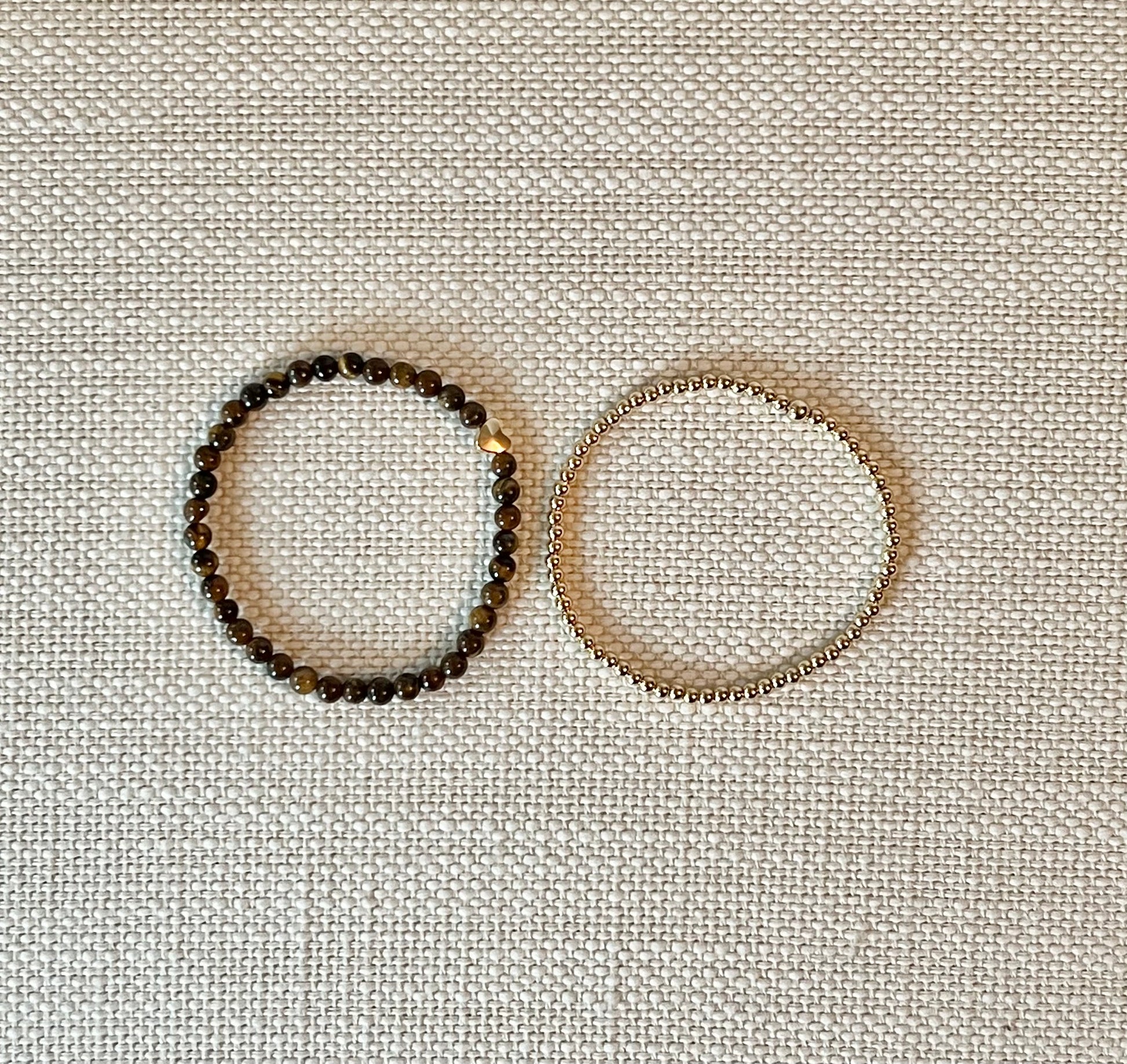 Classic American heritage style meets Sugar Beach Co. with tortoiseshell and gold. Part of the Gemstone Collection, this set includes beautiful marbled tortoiseshell beads (semi-precious tigereye) with the classic Sugar Beach Co. gold heart and a 3mm 14k gold-filled beaded bracelet (daintier than our 4mm size).